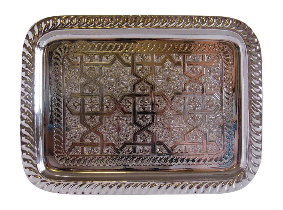 You’ll fall in love with this exquisite Moroccan tea tray, plated in pure silver and engraved with a classic cultural embossed motif