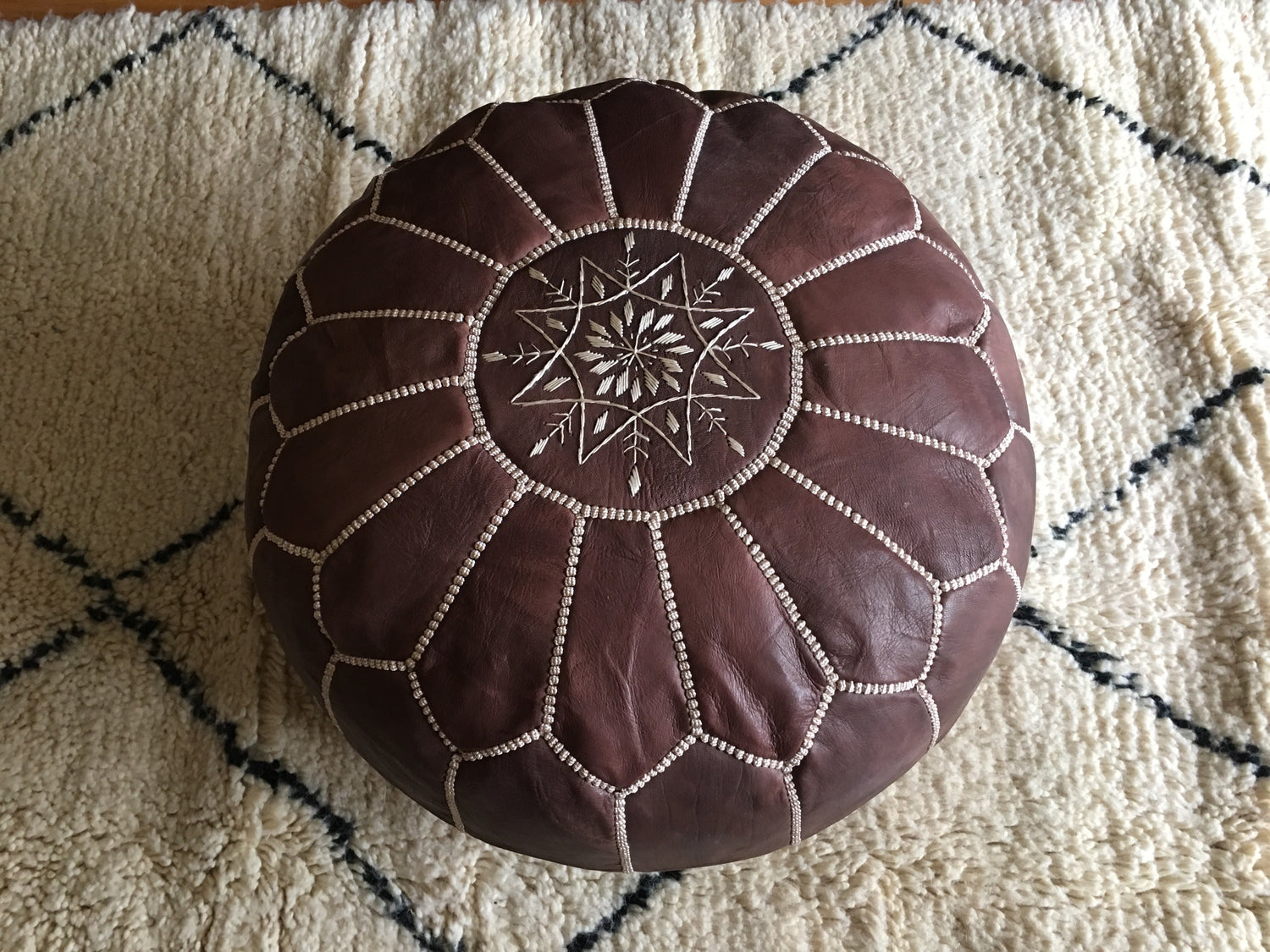 This authentic Moroccan hand-made leather hassock cover, commonly known as poof, is made out of genuine soft leather and has exquisite detailing on the top. Unstuffed, and ready to be filled with a pillow, recycled materials or down.